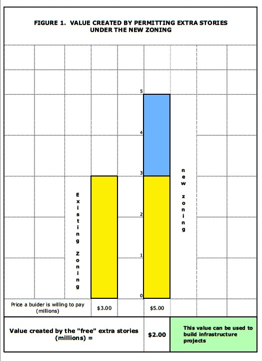 Figure 1 illustrates that the extra value is generated, because a builder is generally willing to pay more for a piece of land if he is allowed to build a more dense development.  The figure shows that if a builder is willing to pay $3 million for a piece of land on which he/she can build a three story structure, then he/she would be willing to pay $5 million provided he can build a 5-story structure on it. The $2 million difference represents the value generated by the extra density allowed.  It can be used to build an infrastructure project of equal value.