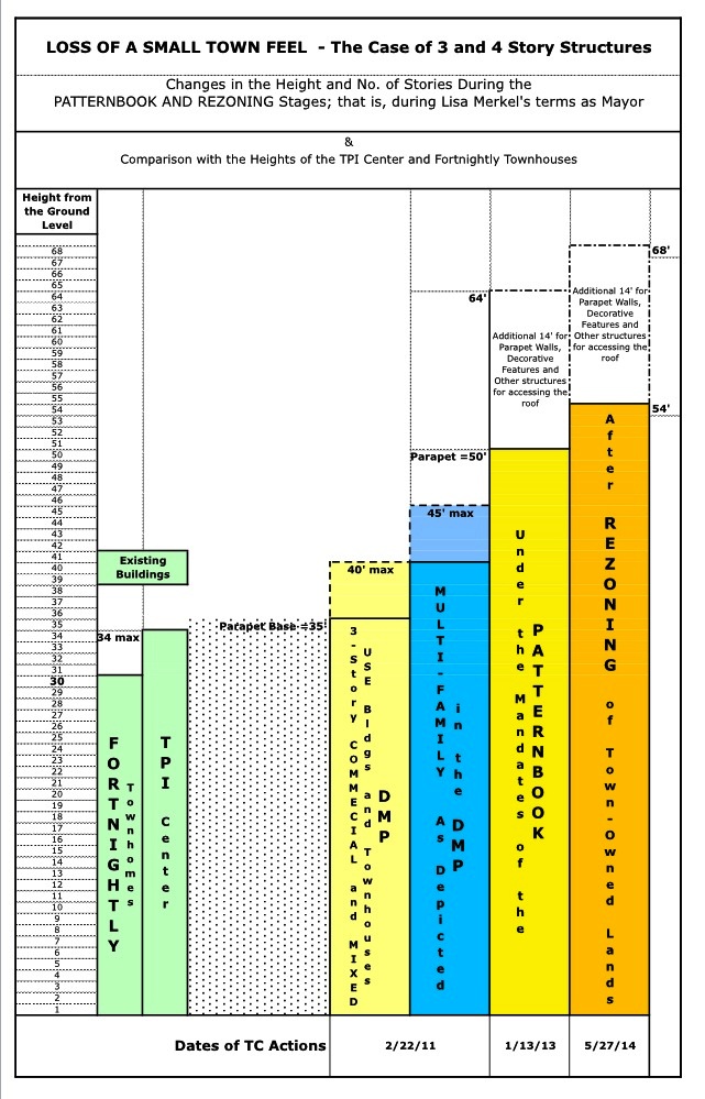The height of the Art Center, an institutional building, was not specified in the DMP. The design of the original (2003) art center was based on a 2-story concept and it is that concept that was supposed to be codified in the DMP. However, less than two months after the DMP was approved, the Herndon Foundation for the Cultural Arts, aided actively by the town staff, and working behind the scenes, had advocated a 4-story Art Center. This advocacy appears to be the start of the sea-change that took place during the 2012-2014 Town Council.